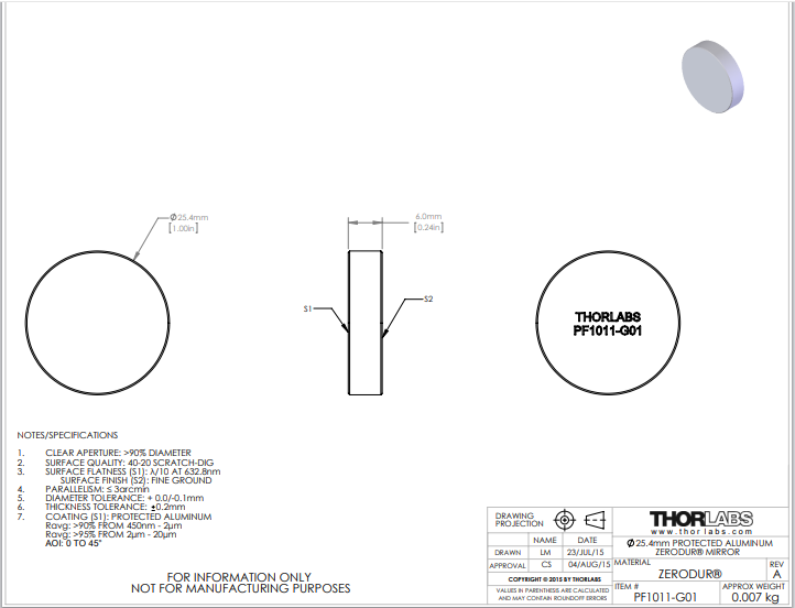 Thorlabs索雷博 PF1011-G01 Zerodur®反射镜