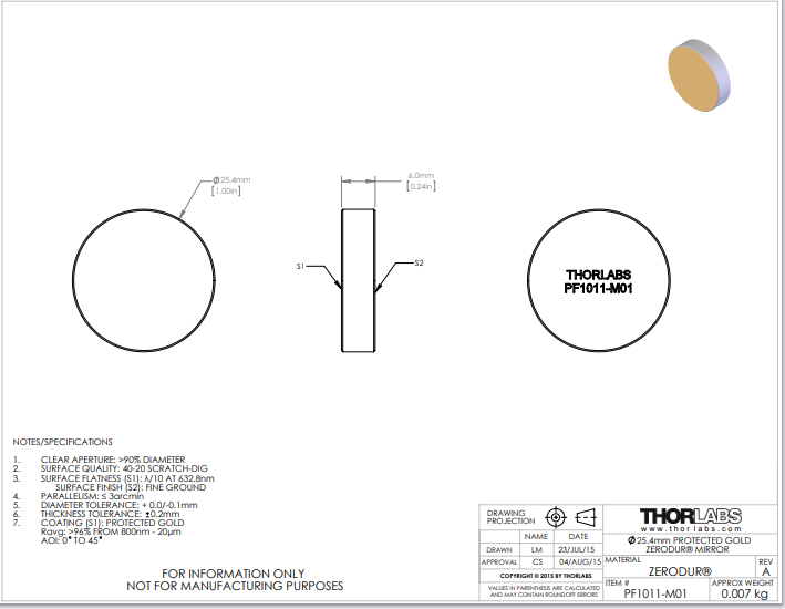 Thorlabs索雷博 PF1011-M01 Zerodur®反射镜