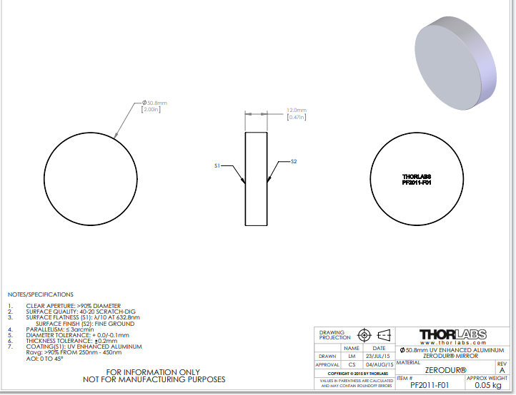 Thorlabs索雷博 PF2011-F01 Zerodur®反射镜