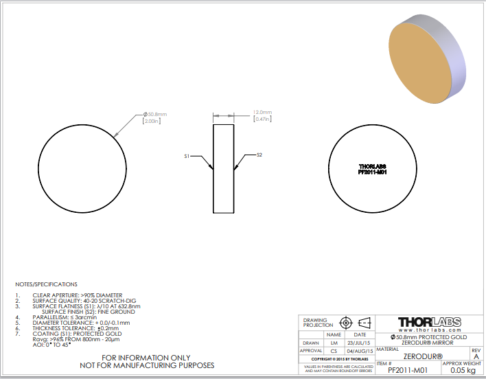 Thorlabs索雷博 PF2011-M01 Zerodur®反射镜