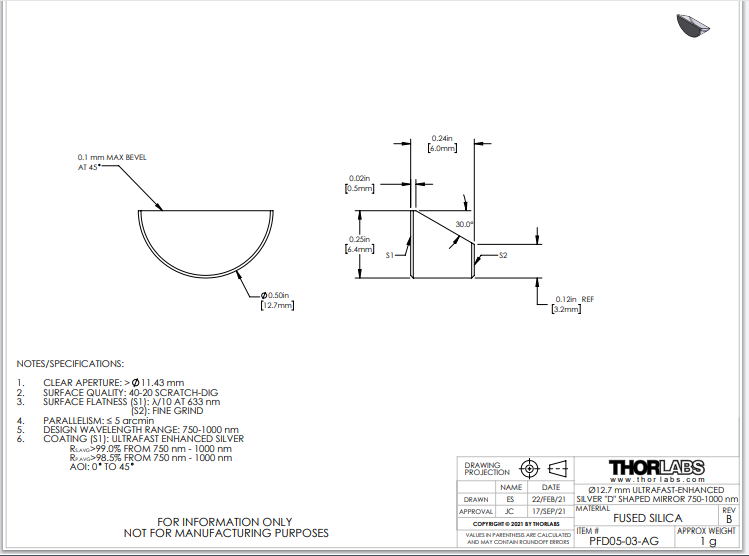 Thorlabs索雷博 PFD05-03-AG D形反射镜