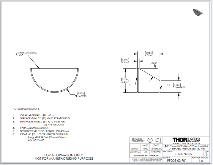 Thorlabs索雷博 PFD05-03-F01 D形反射镜