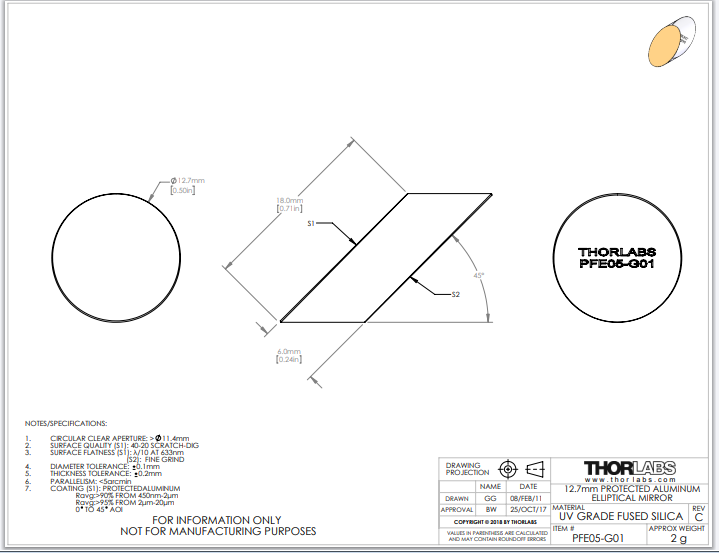 Thorlabs索雷博 PFE05-G01 椭圆反射镜