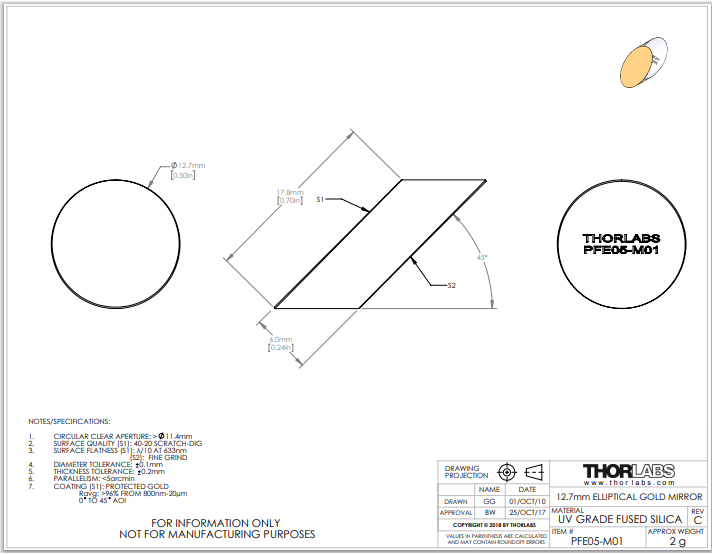 Thorlabs索雷博 PFE05-M01 椭圆反射镜