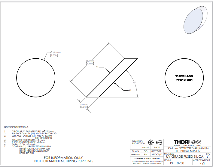 Thorlabs索雷博       PFE10-G01   椭圆反射镜