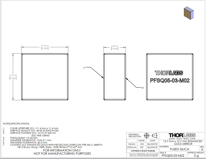 Thorlabs索雷博 PFSQ05-03-M02 平面反射镜