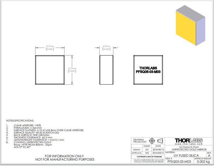 Thorlabs索雷博       PFSQ05-03-M03   方形平面反射镜