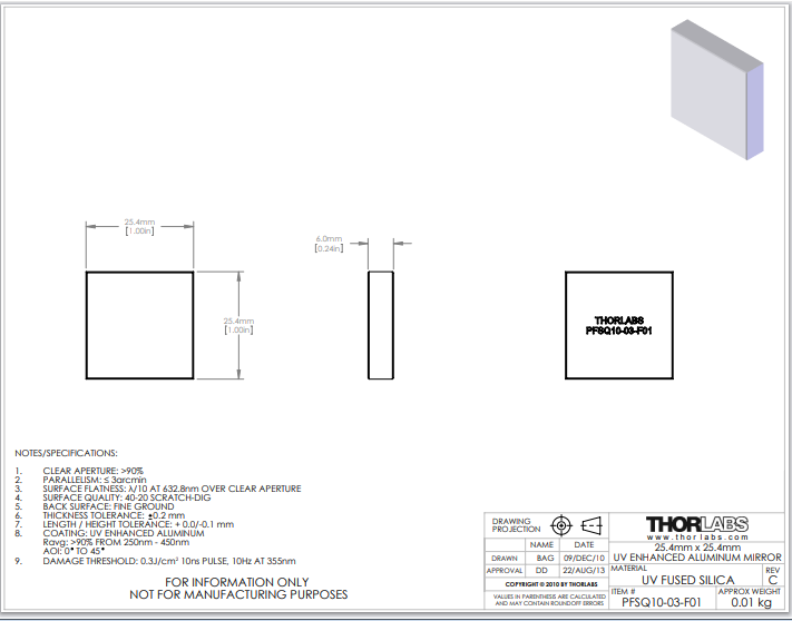 Thorlabs索雷博 PFSQ10-03-F01 平面反射镜