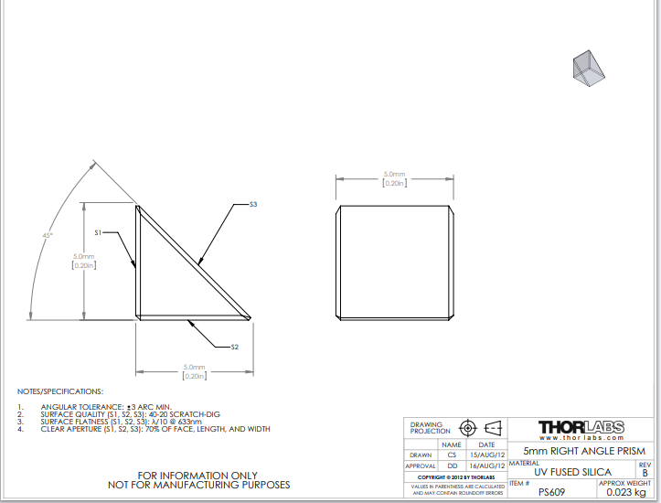 Thorlabs索雷博       PS609   UV熔融石英直角棱镜