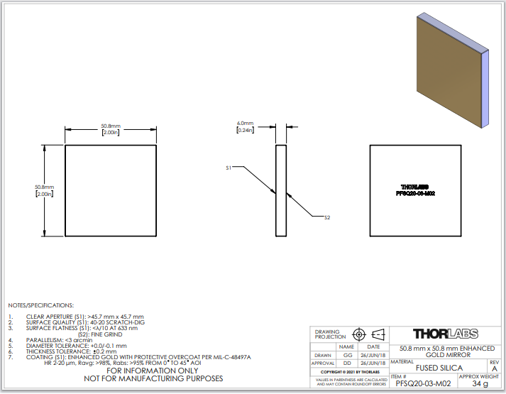 Thorlabs索雷博 PFSQ20-03-M02 平面反射镜
