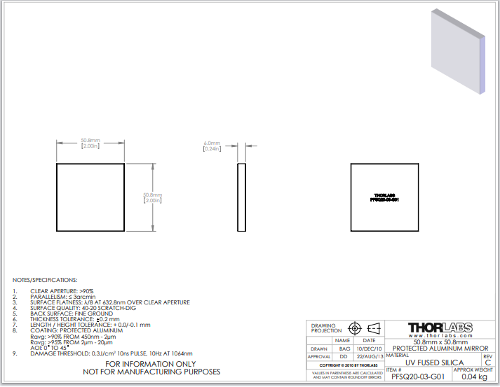 Thorlabs索雷博 PFSQ20-03-G01 平面反射镜