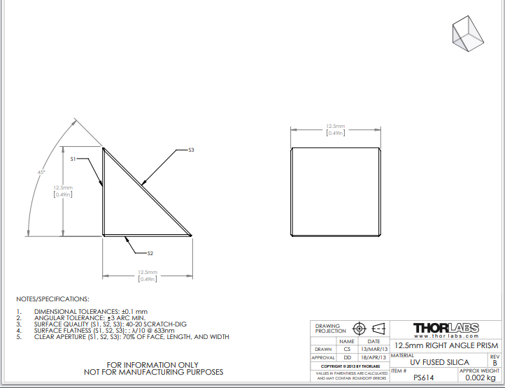 Thorlabs索雷博       PS614   UV熔融石英直角棱镜