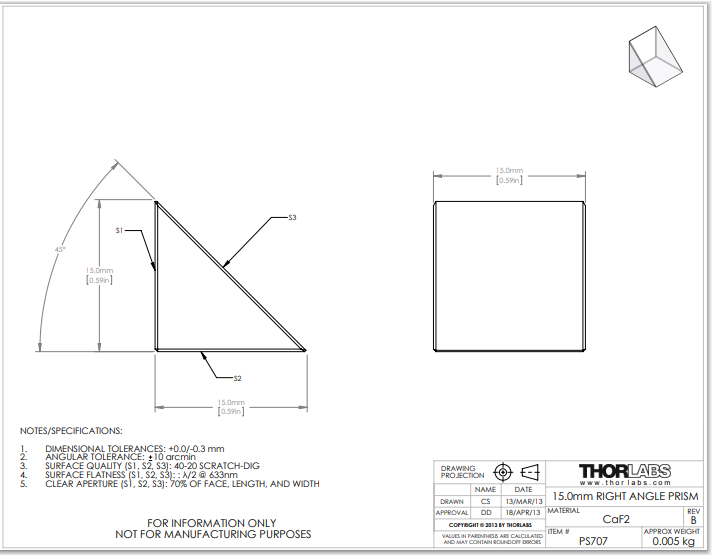 Thorlabs索雷博 PS707 氟化钙直角棱镜