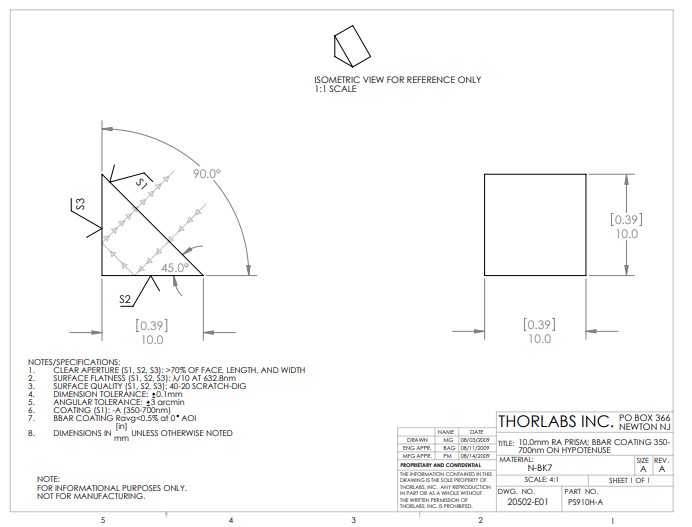 Thorlabs索雷博 PS910H-A N-BK7直角棱镜