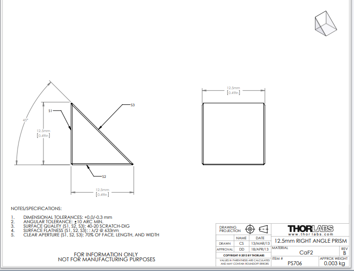Thorlabs索雷博 PS706 氟化钙直角棱镜