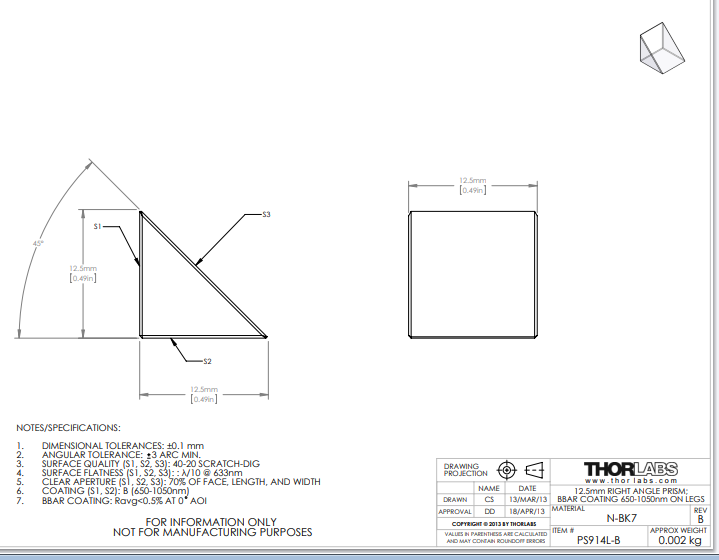Thorlabs索雷博 PS914L-B N-BK7直角棱镜