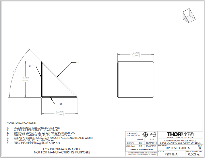 Thorlabs索雷博       PS914L-A   N-BK7直角棱镜