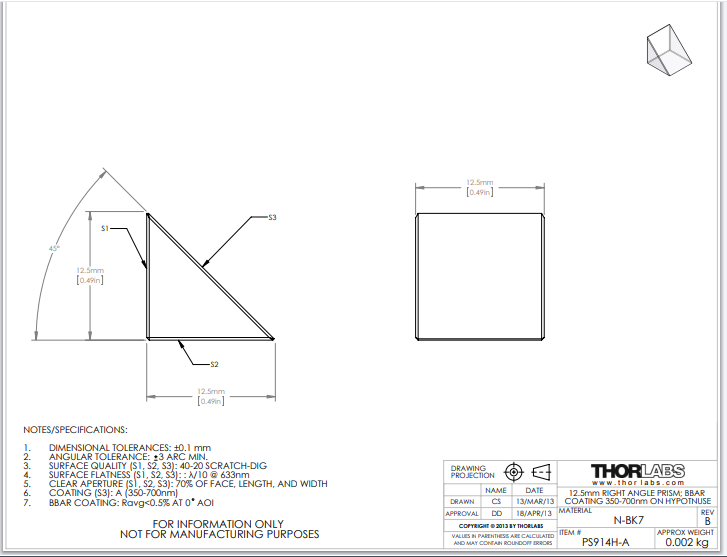Thorlabs索雷博 PS914H-A N-BK7直角棱镜