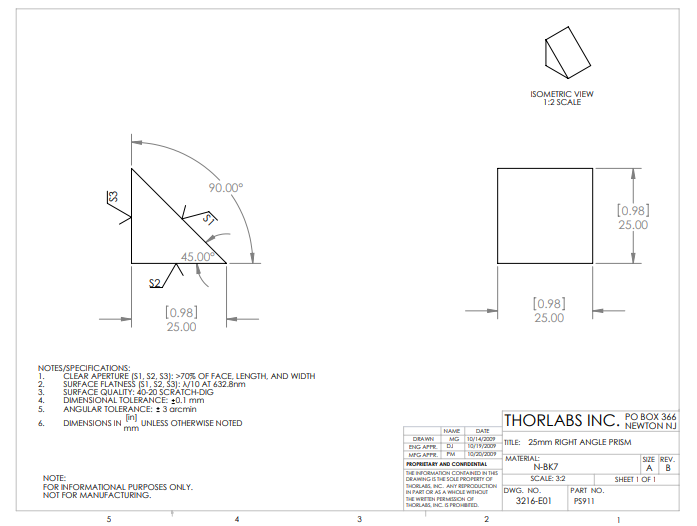 Thorlabs索雷博 PS911 N-BK7直角棱镜