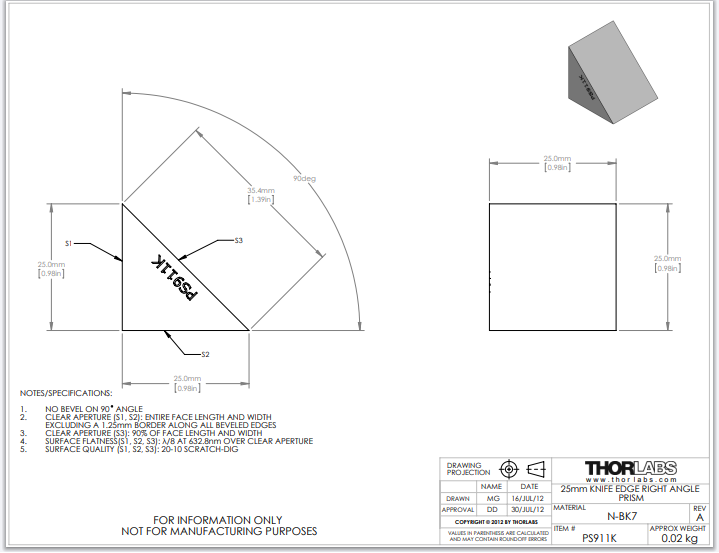Thorlabs索雷博 PS911K N-BK7刀锋直角棱镜