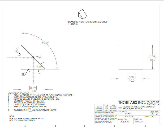 Thorlabs索雷博 PS910L-B N-BK7直角棱镜