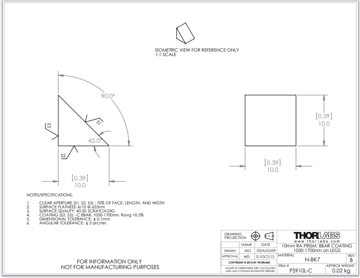 Thorlabs索雷博 PS910L-C N-BK7直角棱镜