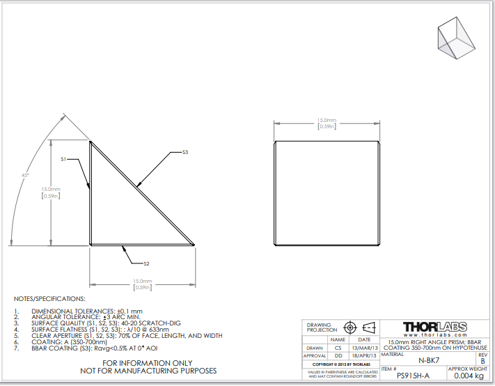 Thorlabs索雷博 PS915H-A N-BK7直角棱镜