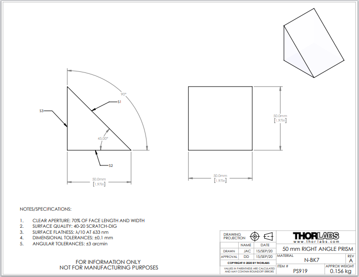 Thorlabs索雷博 PS919 N-BK7直角棱镜