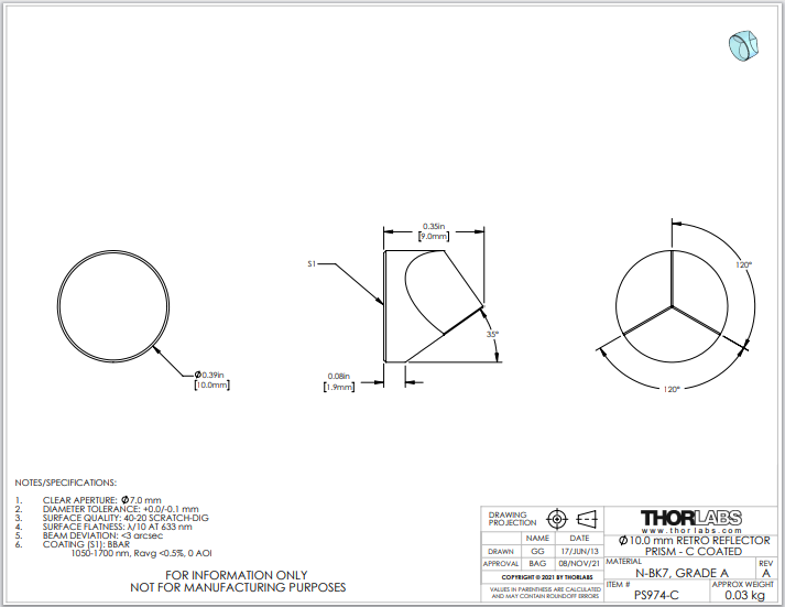 Thorlabs索雷博       PS974-C   TIR回射器