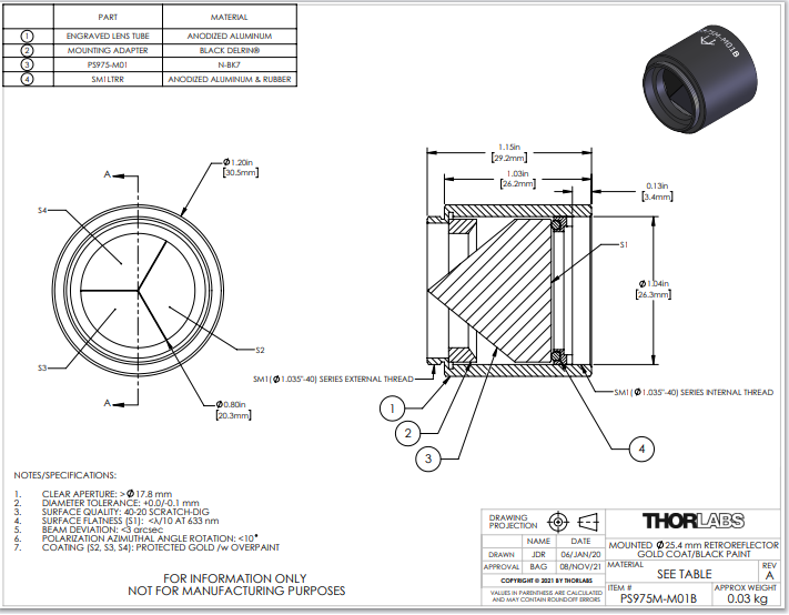 Thorlabs索雷博 PS975M-M01B 镜面回射器