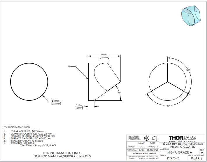 Thorlabs索雷博 PS975-C TIR回射器