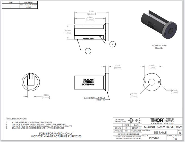 Thorlabs索雷博       PS990M   SM05螺纹已安装的道威棱镜