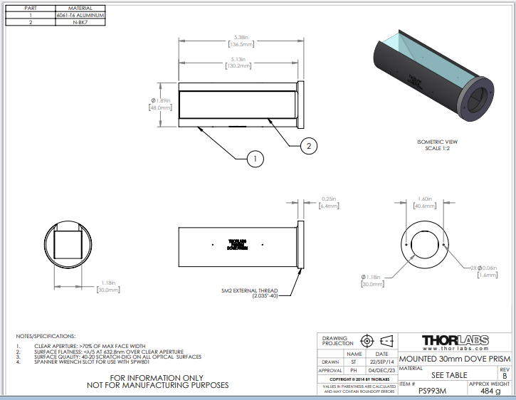 Thorlabs索雷博 PS993M SM2螺纹已安装的道威棱镜