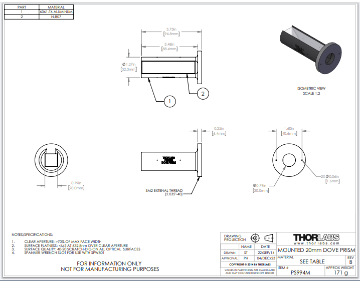 Thorlabs索雷博 PS994M SM2螺纹已安装的道威棱镜