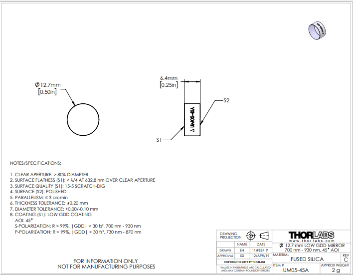 Thorlabs索雷博       UM05-45A   低GDD超快反射镜