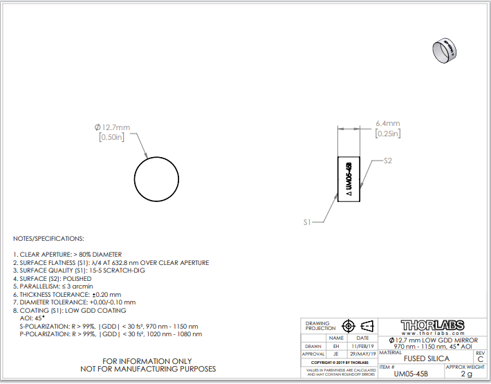 Thorlabs索雷博 UM05-45B 低GDD超快反射镜