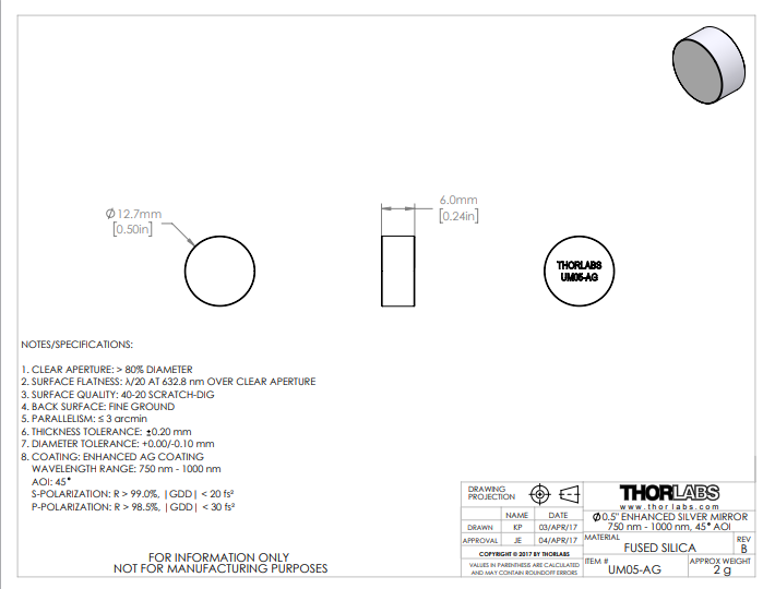 Thorlabs索雷博 UM05-AG 超快增强型镀银反射镜