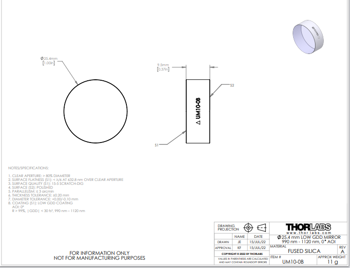 Thorlabs索雷博 UM10-0B 低GDD超快反射镜
