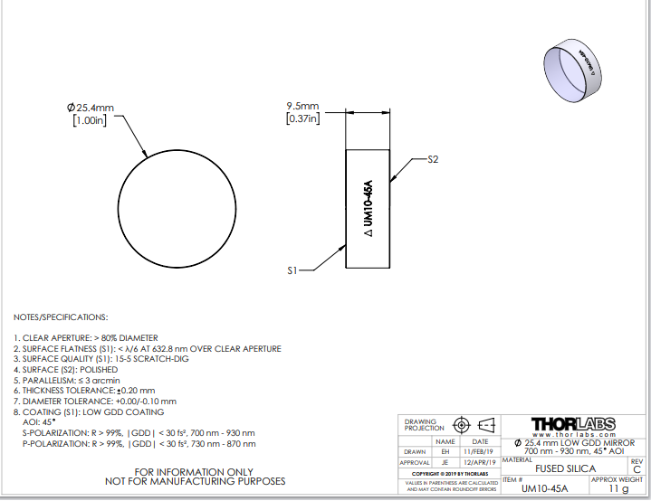 Thorlabs索雷博 UM10-45A 低GDD超快反射镜