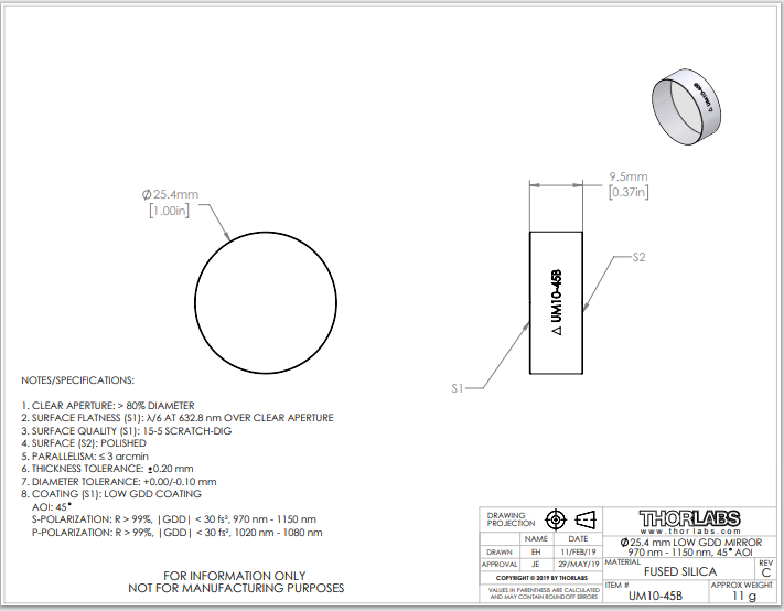 Thorlabs索雷博 UM10-45B 低GDD超快反射镜
