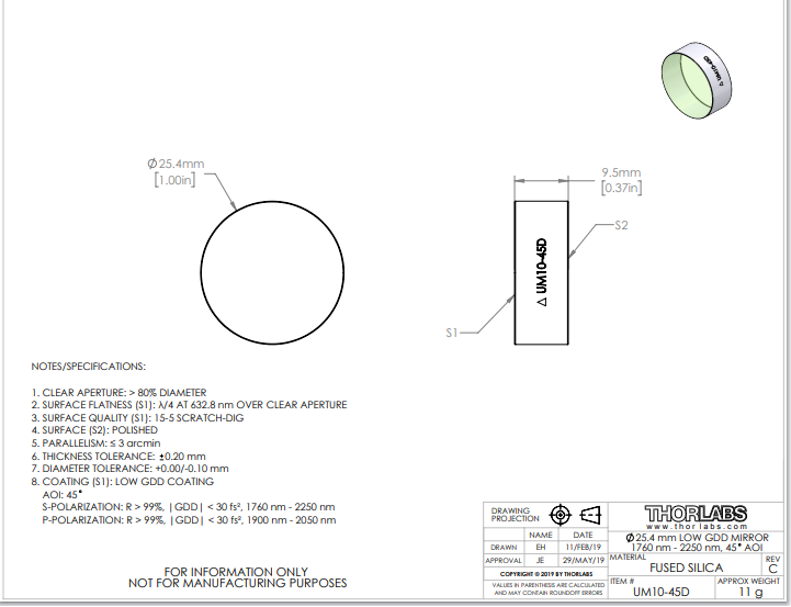 Thorlabs索雷博 UM10-45D 低GDD超快反射镜