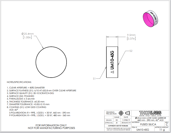 Thorlabs索雷博 UM10-45G 低GDD超快反射镜