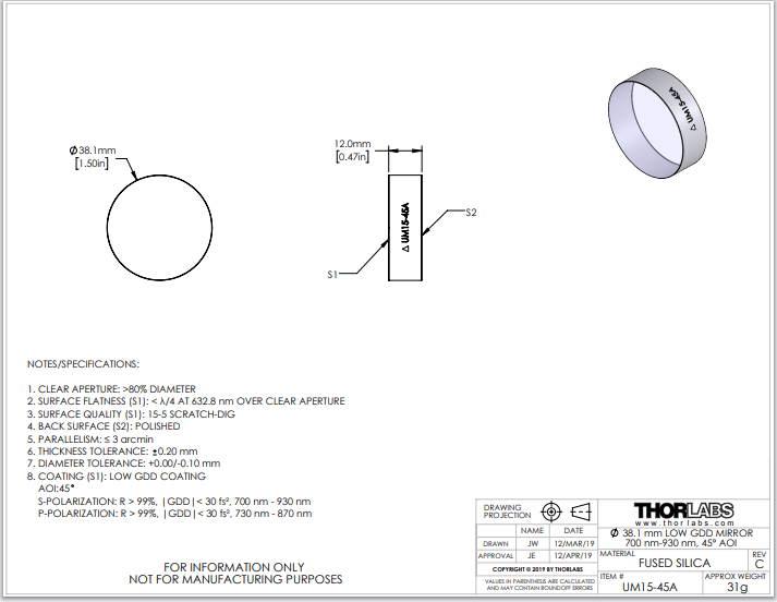 Thorlabs索雷博 UM15-45A 低GDD超快反射镜