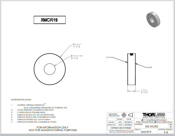 Thorlabs索雷博 XMCR19 Ø1英寸补偿环