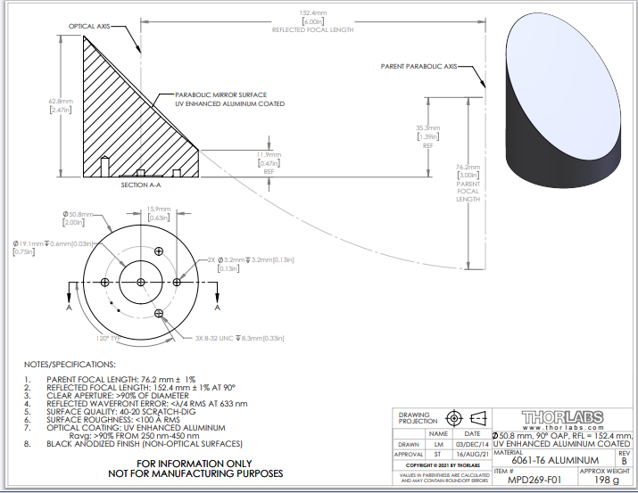 Thorlabs索雷博      cØ2英寸90°离轴抛物面镜