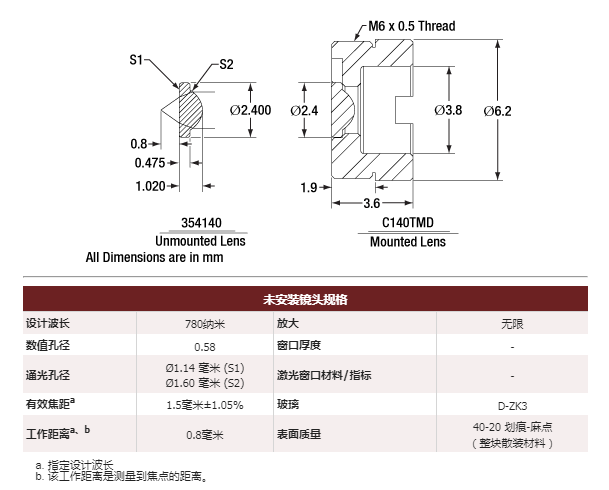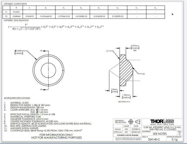 Thorlabs索雷博 354140-C 非球面透镜