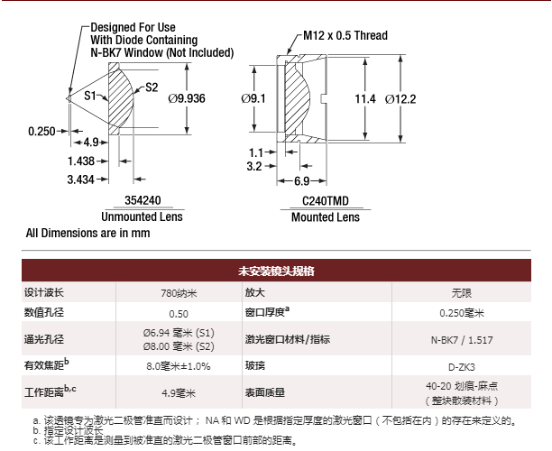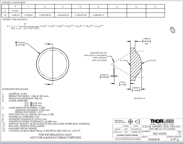 Thorlabs索雷博     354240-B   非球面透镜