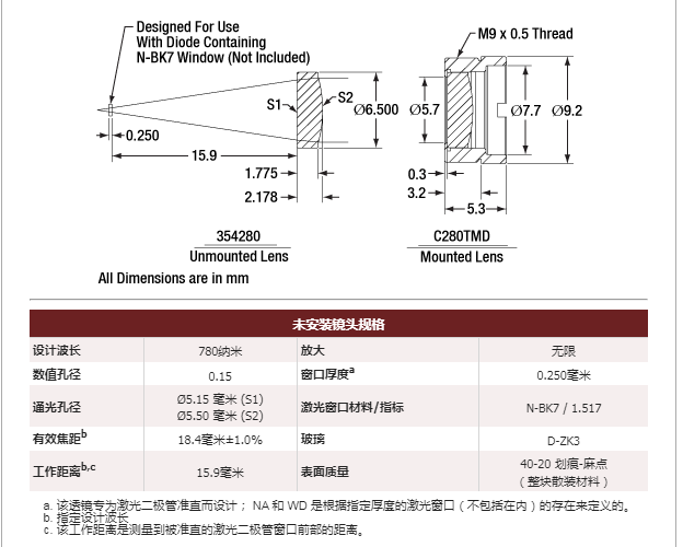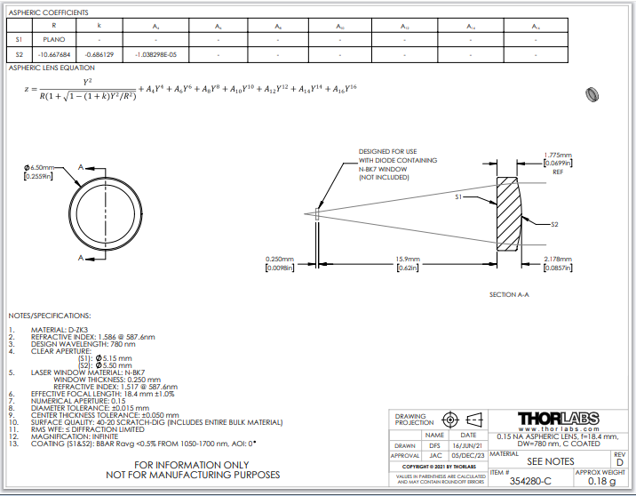 Thorlabs索雷博 354280-C 非球面透镜