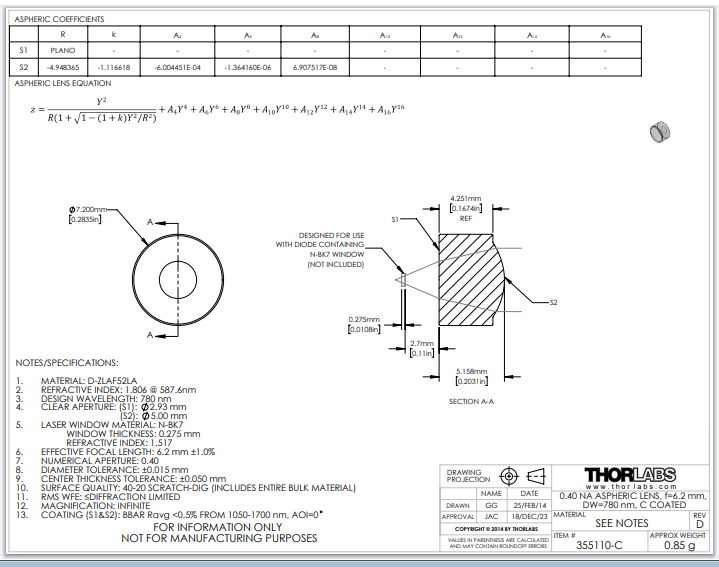 Thorlabs索雷博 355110-C 非球面透镜