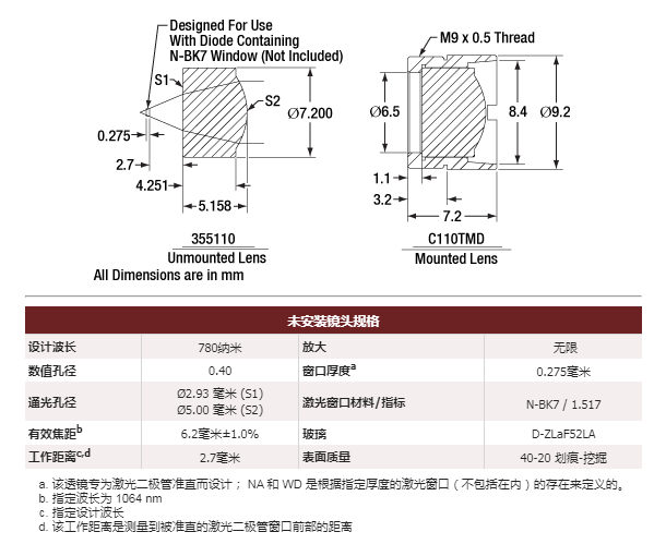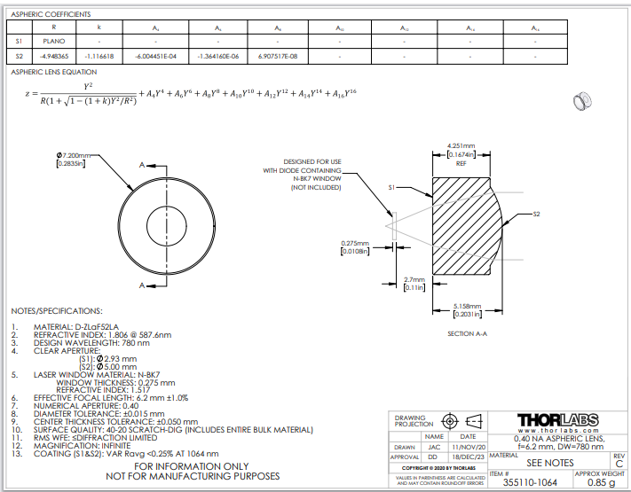 Thorlabs索雷博 355110-1064 非球面透镜
